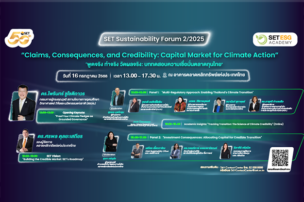 ตลาดหลักทรัพย์แห่งประเทศไทย ขอเชิญท่านร่วมเจาะลึก Insight ในงานสัมมนาแห่งปี SET Sustainability Forum 2/2025 ภายใต้ธีม "Claims, Consequences, and Credibility: Capital Market for Climate Action" 🌏