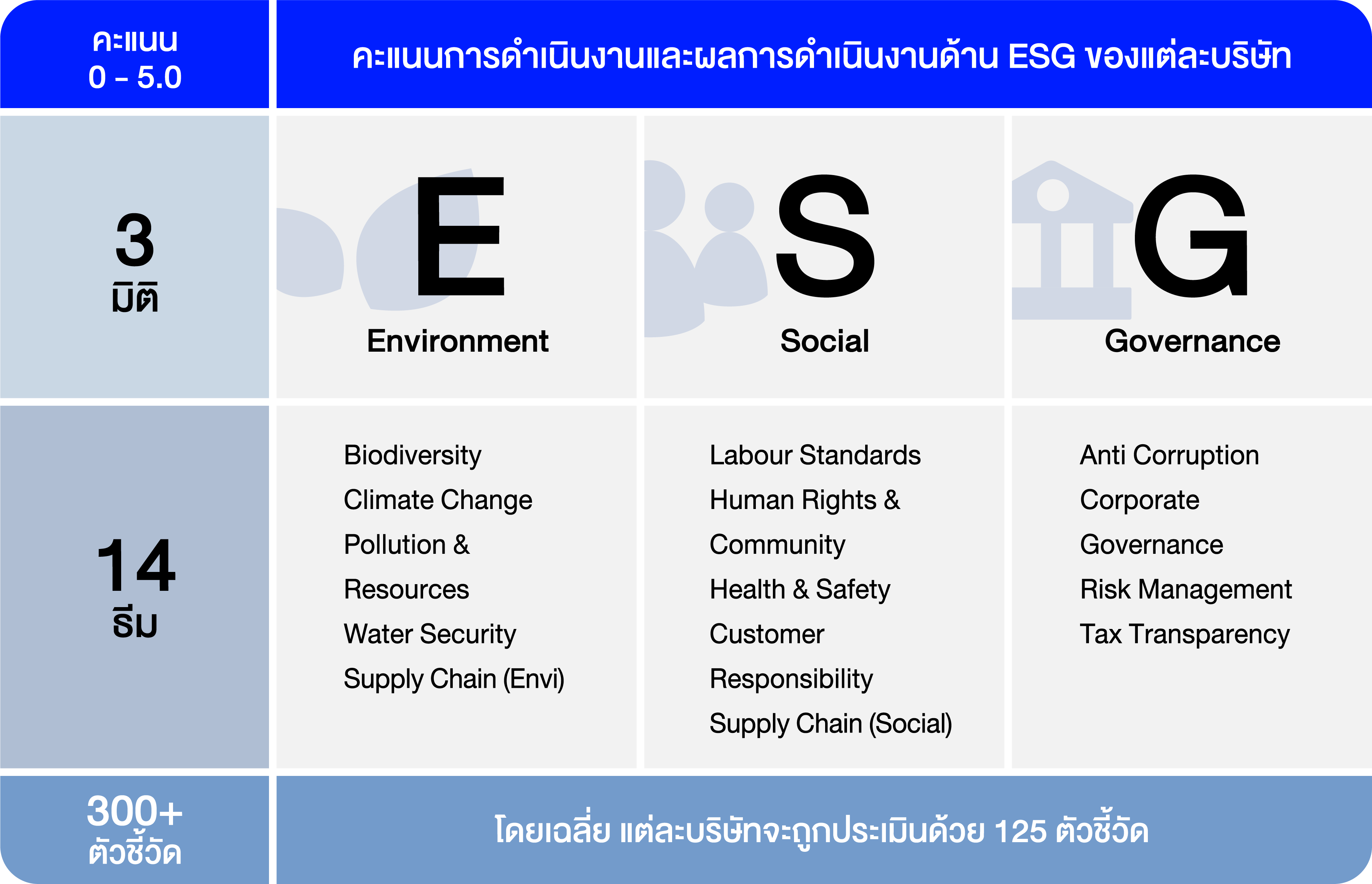- Alignment with global standards: วันนี้มีข้อมูล ESG มากขึ้นและขณะเดียวกันก็มีมาตรฐานการรายงานข้อมูลความยั่งยืนมากมาย อย่างไรก็ดี ไม่ใช่นักลงทุนทุกกลุ่มที่มีความพร้อม หรือมีความเชี่ยวชาญในการวิเคราะห์ข้อมูลดิบด้าน ESG ดังนั้น การประเมิน ESG โดย Global rater ที่มีความรู้ความเชี่ยวชาญจึงเข้ามาเป็นตัวช่วยในการประเมินผลการดำเนินงานด้าน ESG ของบริษัท ซึ่งจะช่วยสนับสนุนการพัฒนาผลิตภัณฑ์การลงทุนและเทรนด์การลงทุนอย่างยั่งยืน