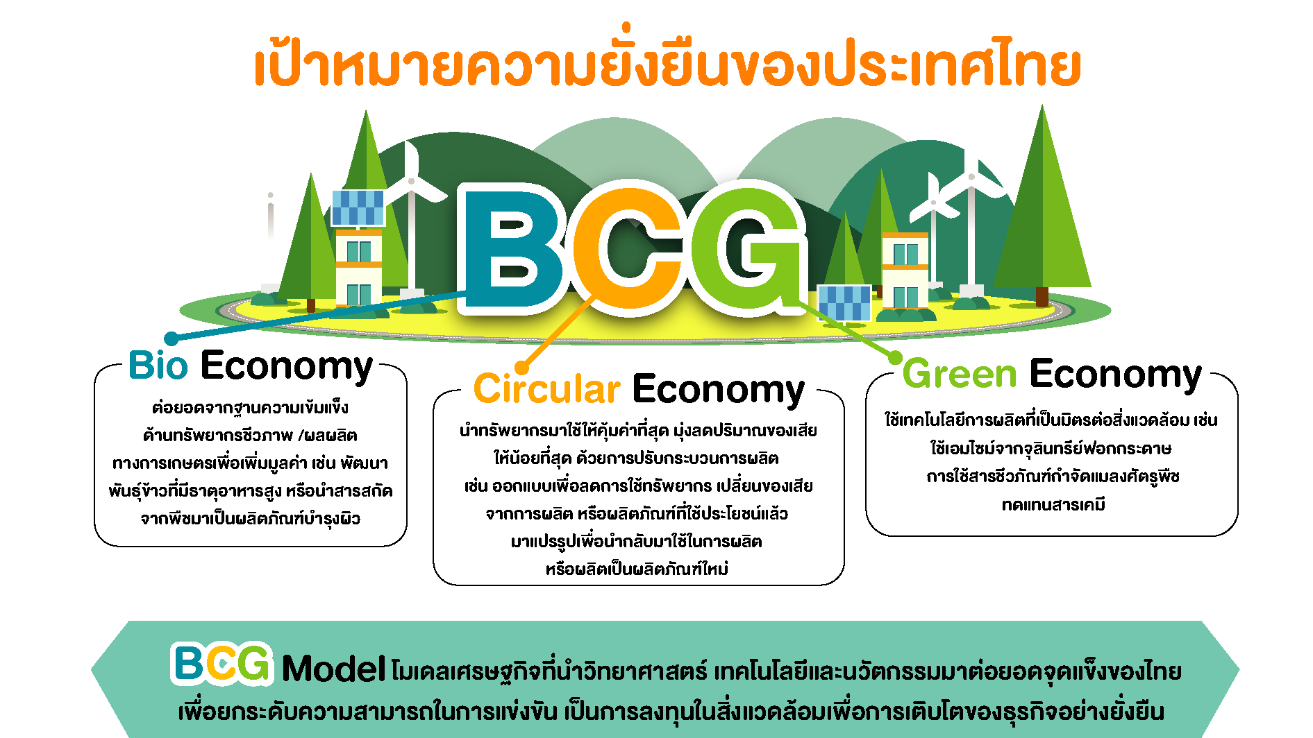 ต่อยอดสู่เป้าหมาย BCG Model ยุทธศาสตร์การขับเคลื่อนการพัฒนาประเทศไทย เน้นเศรษฐกิจที่นำวิทยาศาสตร์ เทคโนโลยีและนวัตกรรมมาต่อยอดจุดแข็งของธุรกิจไทย  นั่นก็คือ การนำคุณค่าจากความหลากหลายทางชีวภาพและวัฒนธรรมมาแปลงหรือเพิ่มเป็นมูลค่าทางเศรษฐกิจ เป็นการนำผลผลิตทางการเกษตรที่อุดมสมบูรณ์ มาปรับเปลี่ยนระบบการผลิตและการบริโภคที่นำไปสู่กระบวนการที่ใช้ทรัพยากรอย่างคุ้มค่า เพื่อรักษาความสมดุลและตอบโจทย์การพัฒนาอย่างยั่งยืน
