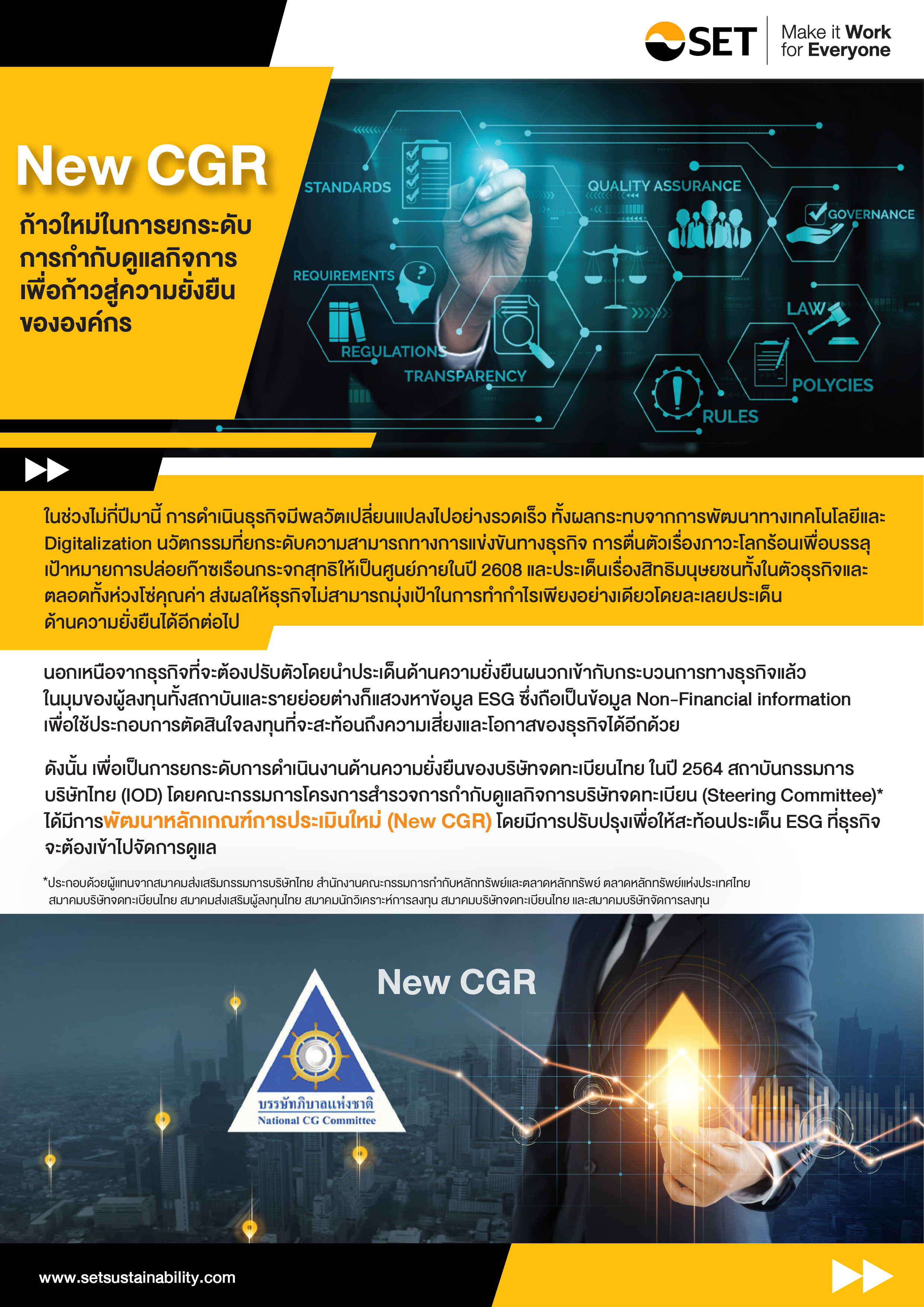 Home Knowledge Libraries CGR New CGR ก้าวใหม่ในการยกระดับการกำกับดูแลกิจการ เพื่อก้าวสู่ความยั่งยืนขององค์กร Topic All AGM Anti-Corruption Auditing Awards BCG Board Diversity Board Effectiveness Board Evaluation Board Meeting Board Roles & Responsibilities Board Structure Business Strategy CGR Circular Economy Climate Change Code of Conduct Corporate Efficiency Corporate Governance Corporate Secretary Corporate Sustainability Disclosure and Reporting DJSI Employee ESG Assessment ESG Integration Ethics Gender Equality GHG Emission Human Rights Innovation Internal Control Investor Relations Materiality Analysis Operational Efficiency Principle and Guidelines Risk Management SD Focus SD Professional Sharing SDGs SET ESG Ratings Shareholder Social Enterprise Social Investment Sustainability Index Sustainable Banking Sustainable Business Role Models Sustainable Consumption Sustainable Exchange Sustainable Finance Sustainable Investment Sustainable Procurement Sustainable Supply Chain THSI Training & Workshop Whistleblowing ทันกระแสธุรกิจยั่งยืน New CGR ก้าวใหม่ในการยกระดับการกำกับดูแลกิจการ เพื่อก้าวสู่ความยั่งยืนขององค์กร Download : New CGR : ก้าวใหม่ในการยกระดับการกำกับดูแลกิจการ เพื่อก้าวสู่ความยั่งยืนขององค์กร Click เพื่อความเข้าใจในเกณฑ์การประเมิน New CGR ได้ดียิ่งขึ้น ทาง IOD ได้จัดงาน New CGR Workshop 2566 ในวันที่ 23 มิถุนายน 2565 เพื่อให้ความรู้เกี่ยวกับหลักเกณฑ์การประเมิน New CGR ผู้สนใจสามารถเข้าลงทะเบียนได้ที่ Click