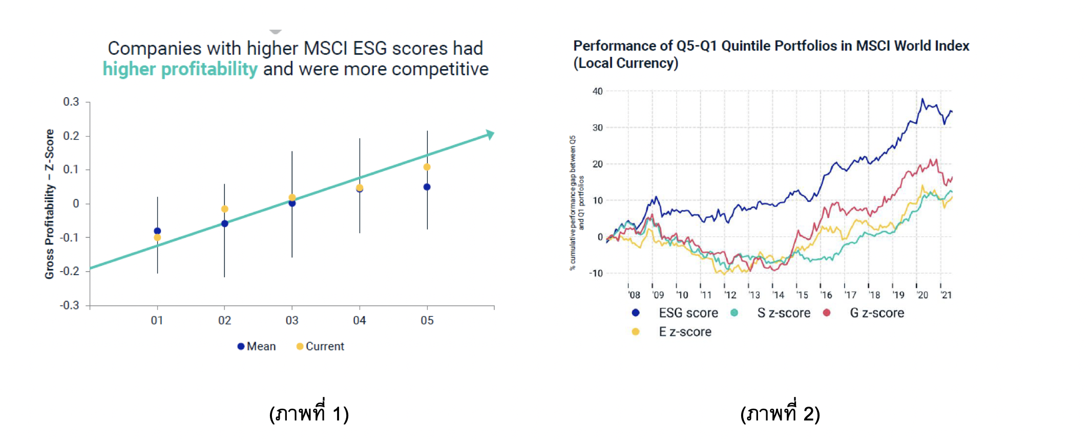 จากข้อมูลของ MSCI พบว่า บริษัทที่มีการดำเนินงานด้าน ESG ได้ดี หรือมีคะแนน MSCI ESG Score สูง จะมีความสามารถในการทำกำไรได้ดีกว่าบริษัทที่มี MSCI ESG Score ต่ำ หรือทำ ESG ได้ไม่ดี (ภาพที่ 1)