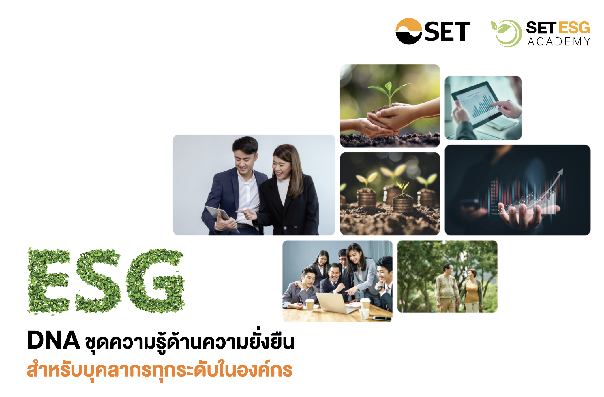 ตลาดหลักทรัพย์แห่งประเทศไทยขอเรียนเชิญบริษัทและองค์กรที่สนใจเข้าร่วม โครงการ "ESG DNA ชุดความรู้ด้านความยั่งยืนสำหรับบุคลากรทุกระดับในองค์กร" ในรูปแบบ E-Learning กว่า 20 หลักสูตร โดยไม่มีค่าใช้จ่ายใด ๆ