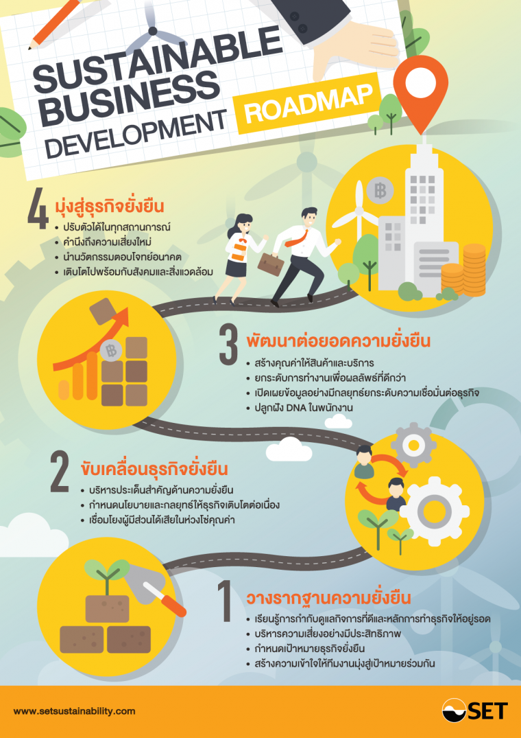 เส้นทางสู่ธุรกิจยั่งยืน Sustainable Business Development Roadmap ผ่าน 4 ขั้นตอน เริ่มจากวางรากฐาน ขับเคลื่อนธุรกิจ พัฒนาต่อยอด และมุ่งสู่ธุรกิจยั่งยืน