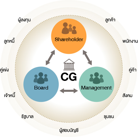 ผู้มีส่วนได้เสียที่เกี่ยวข้องกับธุรกิจมีทั้งภายในและภายนอกองค์กร โดยกลุ่มหลักประกอบด้วย ผู้ถือหุ้น (Shareholder) ซึ่งแต่งตั้ง คณะกรรมการ (Board) เข้ามาทำหน้าที่ควบคุมและกำกับดูแลการทำงานของ ฝ่ายจัดการ (Management) ให้บรรลุเป้าหมายที่กำหนดไว้ รวมถึงคณะกรรมการยังต้องทำหน้าที่สานประโยชน์ระหว่างผู้มีส่วนได้เสียกลุ่มต่างๆ ไม่ให้เกิดความขัดแย้งทางผลประโยชน์และให้เกิดความสมดุล ดังนั้นนอกจากบริษัทควรเข้าใจความต้องการและความคาดหวังของผู้มีส่วนได้เสียที่มีความแตกต่างกันแล้ว ยังต้องกำหนดบทบาทหน้าที่และความรับผิดชอบของแต่ละกลุ่มในระบบการกำกับดูแลกิจการไว้อย่างชัดเจนและอย่างมีจริยธรรม รวมถึงสอดคล้องตามที่กฏหมายกำหนดและตามแนวทางการกำกับดูแลกิจการที่ดีด้วย
