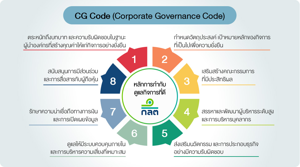 ในปี พ.ศ. 2560 สำนักงานคณะกรรมการกำกับหลักทรัพย์และตลาดหลักทรัพย์ ได้ออก หลักการกำกับดูแลกิจการที่ดี สำหรับบริษัทจดทะเบียนปี 2560 (Corporate Governance Code หรือ CG Code) เพื่อเป็นหลักให้คณะกรรมการบริษัทนำไปใช้เป็นแนวทางในการกำกับดูแลกิจการ โดยหลักการของ CG Code ประกอบด้วย 8 หมวดที่เน้น บทบาทและการทำหน้าที่ของคณะกรรมการ ซึ่งถือเป็นกลไกสำคัญในการขับเคลื่อนและกำกับดูแลกิจการของบริษัทให้มีผลประกอบการที่ดีในระยะยาวอย่างยั่งยืน และเป็นที่น่าเชื่อถือสำหรับผู้ถือหุ้นและผู้มีส่วนได้เสีย