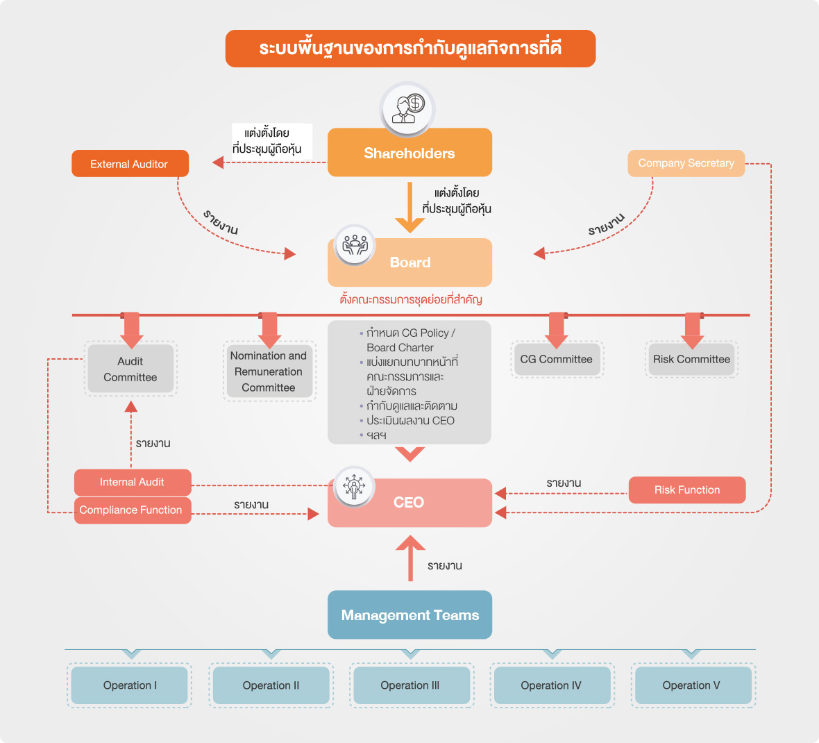 โครงสร้างองค์กรที่มีการกำกับดูแลกิจการที่ดี ควรประกอบด้วยคณะกรรมการที่ถือเป็นตัวแทนในการรับผิดชอบต่อผู้ถือหุ้น ควรมี ความเป็นอิสระจากฝ่ายจัดการ เพื่อกำกับดูแลกิจการให้เป็นไปตามกฏหมายตามวัตถุประสงค์ ข้อบังคับและมติของที่ประชุมผู้ถือหุ้น อีกทั้งคณะกรรมการยัง มีหน้าที่กำหนดกลยุทธ์ วิสัยทัศน์ นโยบาย เป้าหมายและภารกิจ ของบริษัท รวมถึง ติดตามดูแลฝ่ายจัดการให้นำกลยุทธ์ไปปฏิบัติและดูแลผู้มีส่วนได้เสียทุกฝ่ายอย่างเป็นธรรม ทั้งนี้เพื่อให้การปฏิบัติหน้าที่ของคณะกรรมการมีประสิทธิภาพยิ่งขึ้น คณะกรรมการควร แต่งตั้งคณะกรรมการชุดย่อยขึ้นมาทำหน้าที่แทนในบางงานตามความจำเป็น โดยพิจารณาจากขนาดธุรกิจ ความซับซ้อนในการดำเนินธุรกิจ และความเชี่ยวชาญเฉพาะด้านที่ต้องการ เช่น คณะกรรมการสรรหา คณะกรรมการกำหนดค่าตอบแทน คณะกรรมการกำกับดูแลกิจการที่ดี และคณะกรรมการความเสี่ยง รวมถึงการแต่งตั้งเลขานุการบริษัทที่มีคุณสมบัติเหมาะสม เพื่อทำหน้าที่ประสานงานและให้คำแนะนำด้านกฏหมายและกฎเกณฑ์ต่างๆ