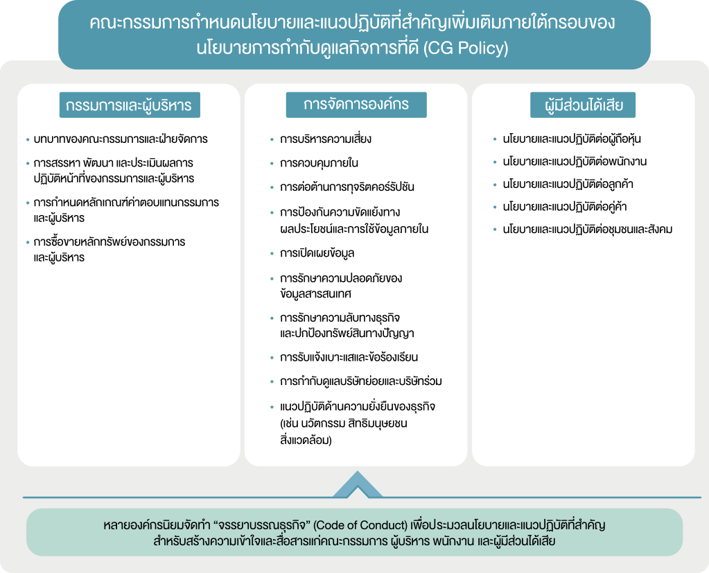 ในการพัฒนาระบบการกำกับดูแลกิจการขององค์กรให้สามารถนำไปปฏิบัติได้จริงและเห็นผลเป็นรูปธรรม จำเป็นต้องมีการกำหนด “นโยบายการกำกับดูแลกิจการ” (CG Policy) เพื่อเป็นกรอบในการกำหนดแนวทางและวิธีปฏิบัติให้สอดคล้องและเป็นทิศทางเดียวกันทั้งองค์กร CG Policy จึงเปรียบเสมือนธรรมนูญขององค์กรที่เป็นลายลักษณ์อักษรและประกาศให้ทุกคนในองค์กร ตั้งแต่ระดับกรรมการ ผู้บริหาร และพนักงาน ตลอดจนผู้มีส่วนได้เสียอื่นๆ ได้รับทราบเพื่อนำไปปฏิบัติโดยทั่วกัน
