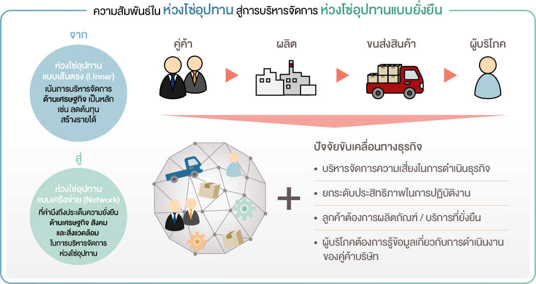 ที่ผ่านมา ธุรกิจการบริหารจัดการห่วงโซ่อุปทานมีลักษณะไม่ซับซ้อน ประกอบด้วยผู้มีส่วนเกี่ยวข้องจำนวน ไม่มาก บริษัทส่วนใหญ่จึงเน้นพัฒนาประสิทธิภาพด้านเศรษฐกิจเป็นสำคัญ เช่น การพัฒนาคุณภาพเชิงเทคนิค การลดต้นทุน และเพิ่มความรวดเร็วในการจัดส่งสินค้า เป็นต้น แต่ปัจจุบันการดำเนินธุรกิจมีความซับซ้อนมากขึ้น ทำให้ผู้มีส่วนเกี่ยวข้องหลากหลายขึ้น การดำเนินกิจกรรมในห่วงโซ่อุปทานเปลี่ยนเป็นรูปแบบเครือข่าย (Network) โดยมีความต้องการของ "ลูกค้า" เป็นแรงผลักดันสำคัญและส่งผลต่อผู้มีส่วนเกี่ยวข้องอื่นๆ เพิ่มขึ้นด้วย ไม่ว่าจะเป็น ผู้จำหน่ายวัตถุดิบ ผู้ผลิต ผู้จัดจำหน่ายและผู้ขนส่ง ต้องร่วมมือกันเพื่อยกระดับขีดความสามารถในการแข่งขัน ในขณะเดียวกัน ผู้มีส่วนได้เสียอื่น อาทิ ผู้บริโภค ผู้ลงทุน พนักงาน และสังคม ต่างได้ให้ความสำคัญและเรียกร้องให้ธุรกิจบริหารจัดการประเด็นด้านสังคมและสิ่งแวดล้อมที่ส่งผลกระทบต่อตนเอง ตลอดจนต้องการให้บริษัทเปิดเผยข้อมูลเกี่ยวกับการบริหารจัดการตลอดห่วงโซ่อุปทานมากขึ้น