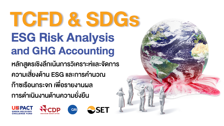 UK PACT Green Recovery Challenge Fund (GRCF) และตลาดหลักทรัพย์แห่งประเทศไทยจึงร่วมจัดหลักสูตร TCFD & SDGs Workshop: ESG Risk Analysis and GHG Accounting ในชื่อว่า “UK PACT Green Recovery Challenge Fund Capacity Building Program for Thailand – ESG Risk Analysis and GHG Accounting Workshop” เมื่อวันที่ 18-19 ต.ค. 2564 โดยมีวิทยากรจาก GRI, CDP และวิทยากรรับเชิญเป็นผู้บรรยาย และนำ VDO Clip บันทึกการสอนดังกล่าวมาเผยแพร่สำหรับผู้สนใจเรียนรู้ด้วยตนเองในรูปแบบ e-Learning ผ่านช่องทาง YouTube ในชื่อหลักสูตร TCFD03 e-Learning: TCFD & SDGs - ESG Risk Analysis and GHG Accounting